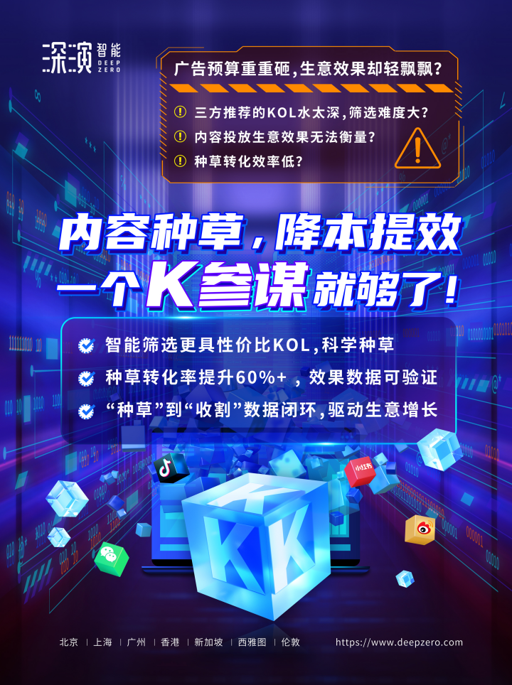 2121非凡智能K参谋科学前选,可跨领域找到最能影响品牌目标TA人群的KOL进行投放,同时有效平衡投资回报率;内容营销数据可同电商后链路平台打通,进行数据归因分析,准确判断KOL影响的用户是否真实在电商平台产生购买行为;实现“种草”到“收割”链路闭环,轻松内容营销,可根据品牌方的业务需求提供一站式的KOL采买及数据验证服务,有利提升整体内容营销的效率与效果。