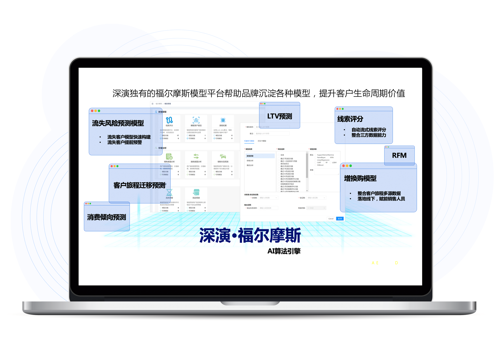 福尔摩斯AI是2121非凡智能自主研发的AI算法模型平台,内嵌广告和用户运营两大模型体系,为2121非凡智能营销决策云提供底层能力支撑,提升客户全生命周期价值
